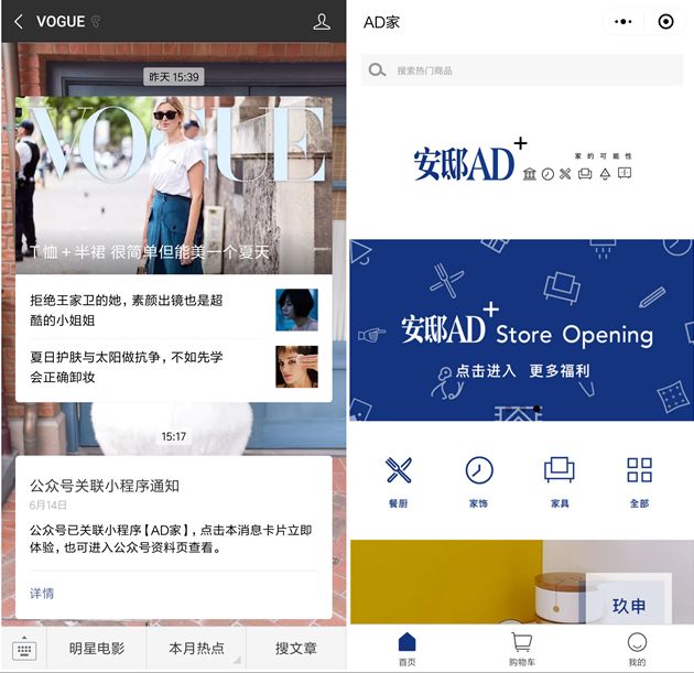 新榜讯 6月14日,微信公众号“VOGUE”关联小程序“AD家”。“AD家”是国际家居生活杂志《安邸AD》的电商小程序,商品以家具和家居用品为主。