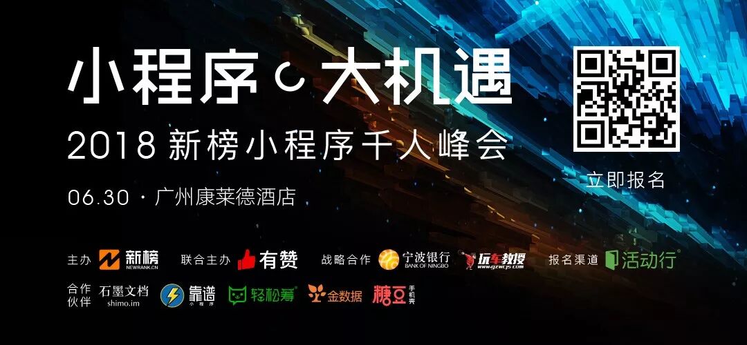 6月30日,SEE小电铺创始人万旭成将作为嘉宾,参与2018新榜小程序千人峰会,扫描下方图片二维码即可买票。