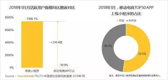据QuestMobile数据显示,2018年1月,电商小程序活跃用户规模增速是移动电商App的239.4倍,电商领域从业者纷纷部署小程序,排名前50的App中超过半数已经上线运营。