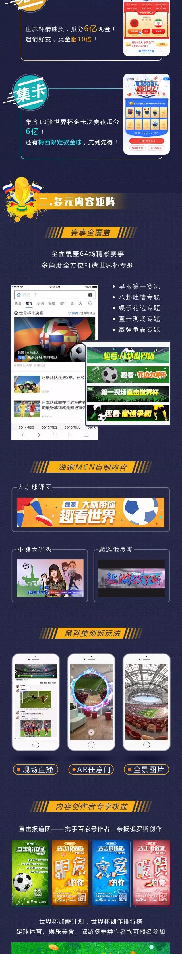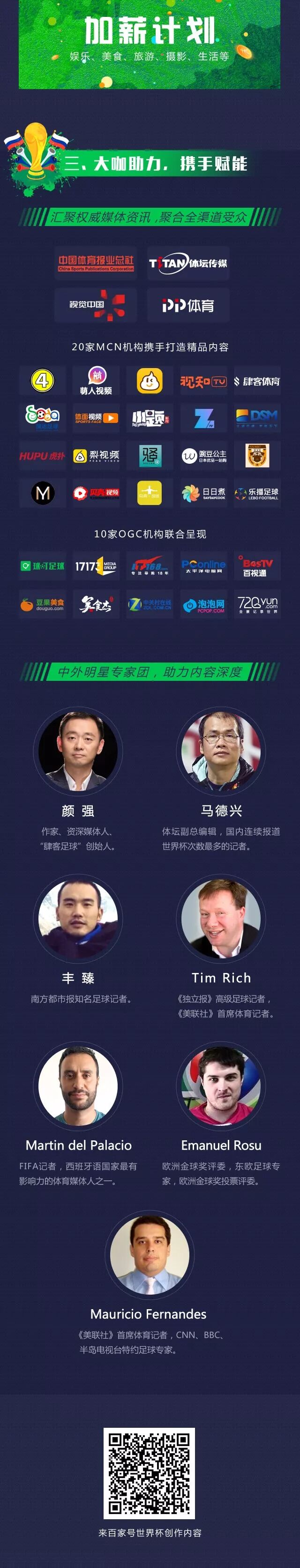 除此外,百家号开展世界杯作者加薪计划,不仅针对体育垂类的优质原创作者,还有擅长娱乐、美食、旅游、摄影、生活等周边垂类的作者,对招募后入选作者固定的自荐机会和额外现金奖励。