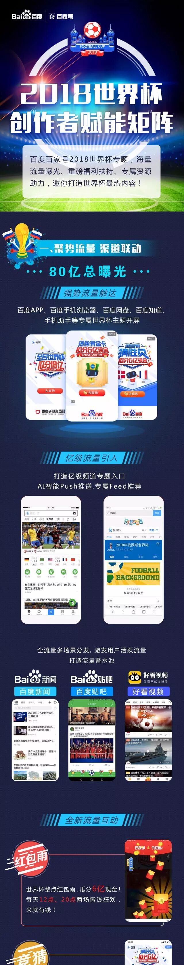 在世界杯期间,百度App上线世界杯频道入口、智能feed流和push推荐,匹配最契合的内容受众,为内容创作者聚势流量,全网曝光量达80亿。