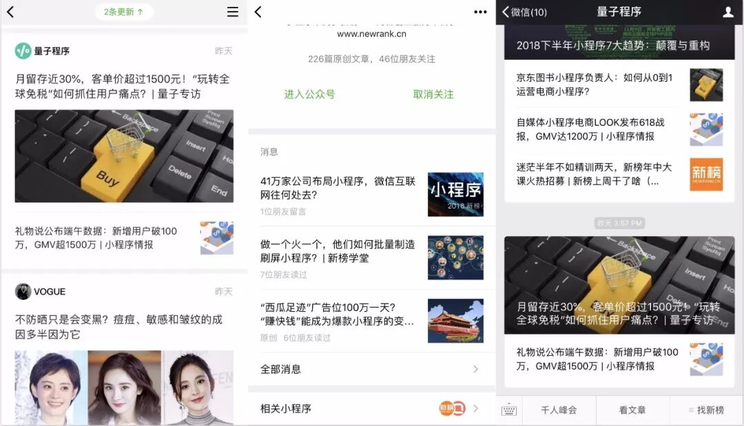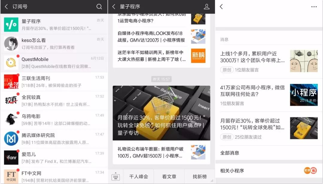 改版对关联小程序有两个影响:一是以后公众号关联小程序,用户都收不到提醒了——之前可以重复关联,且不占用推送次数。二是用户从“内容流”到“会话框”的流失率,大大提高,用户很难看到关联页面。