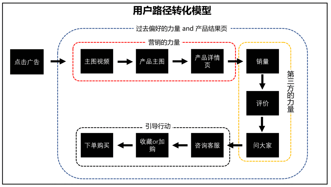 用户路径:进入产品—>主图视频—>产品主图—>产品详情页—>产品属性(销量、标题)—>评价—>问大家—>咨询客服—>收藏or加购—>下单购买