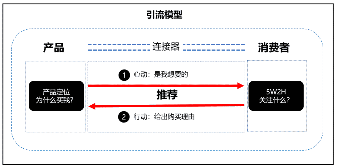 他们三者之间的运作关系:“产品本身”决定“消费者”,通过“连接器”将二者建立联系,会分别先后产生“心动“和”行动”的行为。