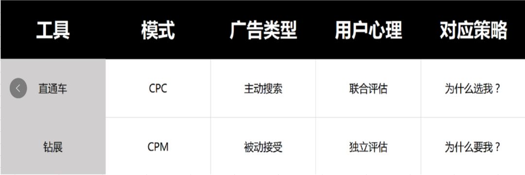 钻展是主动推荐位广告,对应的场景是“偏向逛的场景,属于推荐场景”,用户购买目的性尚未明确,处于闲逛状态。用户在无意中看到你广告后,会处于“独立评估”状态,这时候你的营销策略是“唤醒用户需求”,告诉用户“为什么要选我的”。