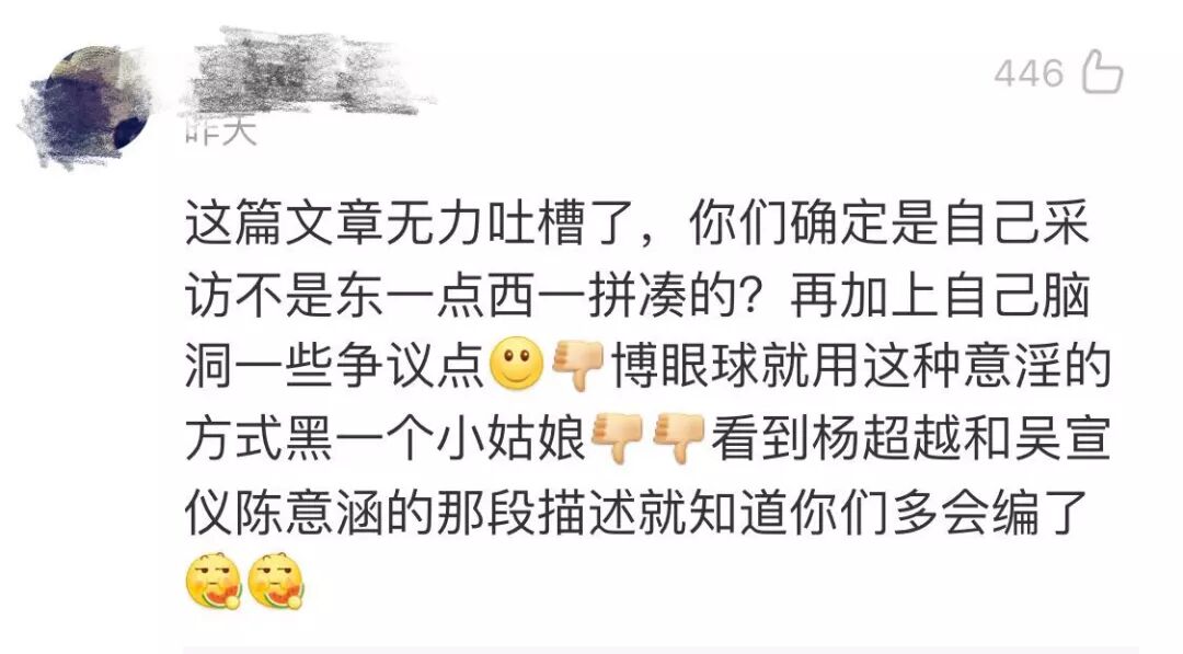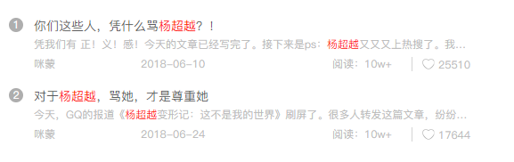 “咪蒙”的言论也同样遭到了diss,曾在GQ任职的“乌云装扮者”就在公号发文称,“你可以不pick杨超越,但是不要pick咪蒙”。