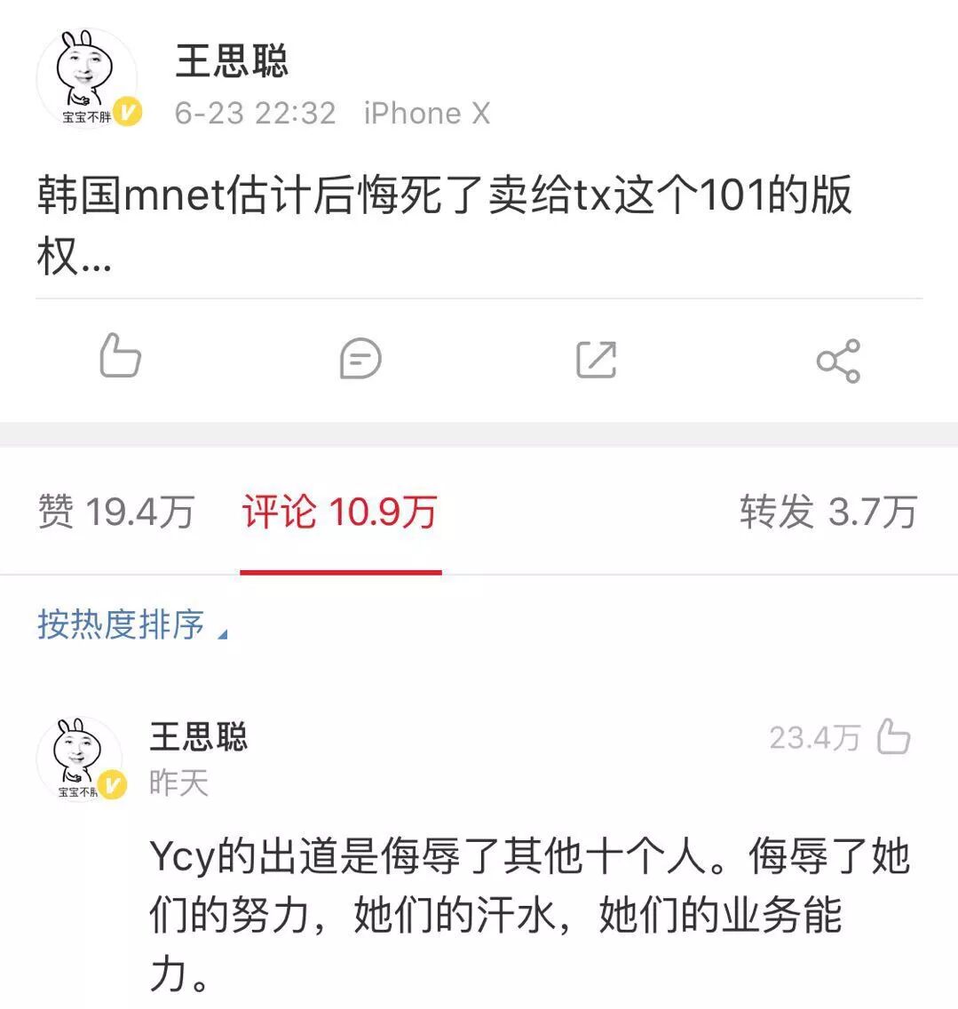 王思聪连发数条对《创造101》的吐槽,其中diss杨超越的微博评论获得了20多万点赞。