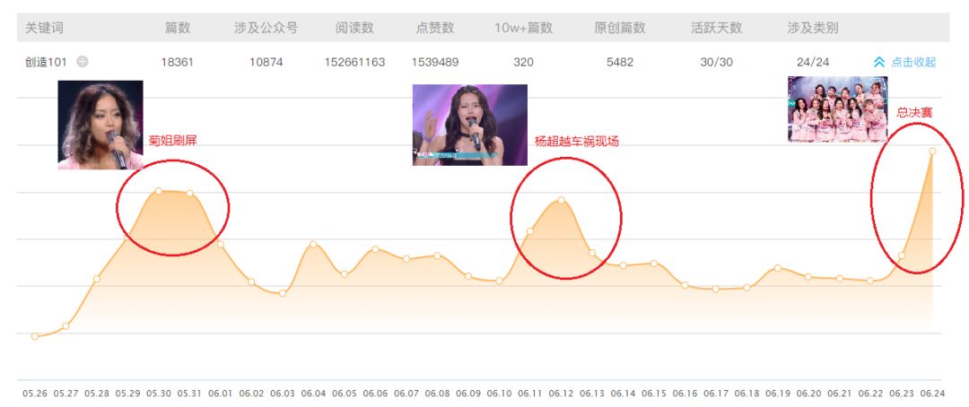 榜妹还观察了近期围绕“创造101”诞生的微信文章,发现一共有三次高峰,第一次是因为菊姐,第二次是杨超越车祸现场,第三次是总决赛,很大程度也是因为杨超越。