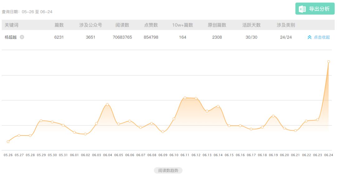 这样满身争议的人物,对于自媒体而言也是一个宝库。从新榜日常监测的60.8万公众号样本的趋势数据可以看到,近一个月来,围绕杨超越诞生的10w+爆文已有164篇。几乎每一期节目之后都会有一个高峰,决赛后一天更是迎来顶峰。