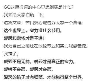 标题、写法都是“咪蒙”一贯的风格,罗列了三条理由一一批判,将GQ报道所表达的意思归纳为“爱哭和卖惨才是王道”,认为大篇幅描写杨超越的惨和穷是为她开脱。