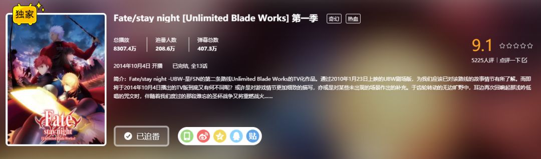 2014年10月,B站购进了一部影响力深远的独家动画《Fate/stay night(UBW)》(其实2012年时引进的《Fate/zero》对B站的意义更大,是很多粉丝和UP主的入坑作)。