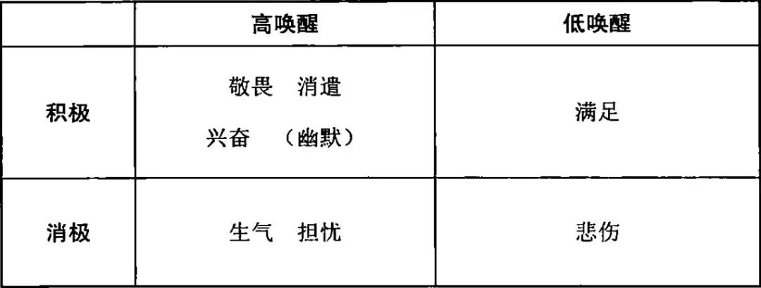 敬畏、消遣、兴奋等积极性情绪具是高唤醒状态。生气、担忧等消极性情绪是高唤醒状态。
