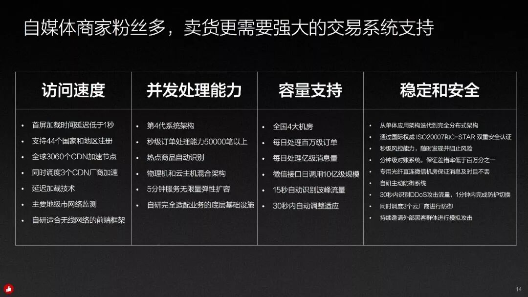 第一类是商家通过有赞微商城可以自建独立商城。微商城有H5版、小程序版,很快还会有UGC版。目前为止,微商城每秒可以扛住6万笔交易。什么概念?像 “黎贝卡的异想世界”,它一次群发,你就得一秒钟扛得住1万笔交易。如果扛不住,整个系统就会宕机。目前,经常会有自媒体商家,尤其是传统媒体商家,1秒钟的订单量达到两三万笔是很正常的。