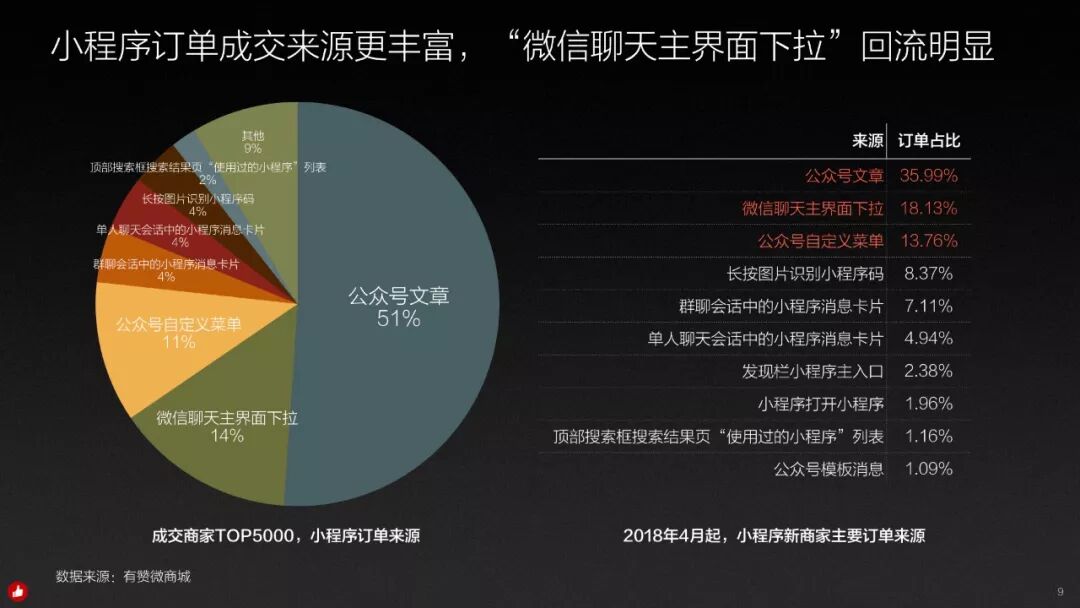 在小程序的时代,你会发现订单来源开始分散了,公众号文章在下个月再出的时候应该低于51%。微信聊天主界面下拉(注:小程序任务栏)一路飙升到14%,后面可能还会更高。而且下拉现在其实体验并不好,只能展示4-5个,导致的结果是强者恒强,可以再做一些优化。微信聊天主界面下拉对于个体商家来说,可能比例会变得更高。