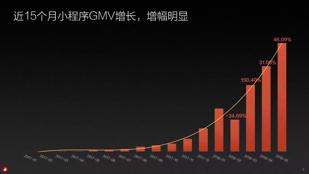 这是过去15个月,有赞体系下小程序GMV的增长。除了2月份春节掉下去了一点,3月份又直接拉回来了,4月份增长超30%,5月份增长超40%。6月份没有意外的话,应该也会超过50%,这是整个小程序GMV的增长。