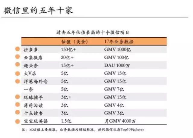 2. 能回到主舞台的另一个核心原因,投资人开始接受“微信互联网”这个概念,微信成为基础设施,就像PC端的操作系统。下图是42章经总结的5年10家微信生态中的明星创业公司。其中拼多多马上要赴美上市了,估值300亿美金。