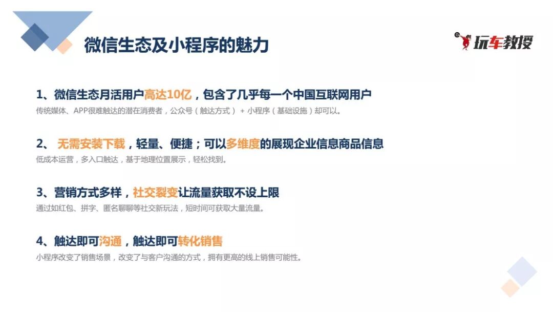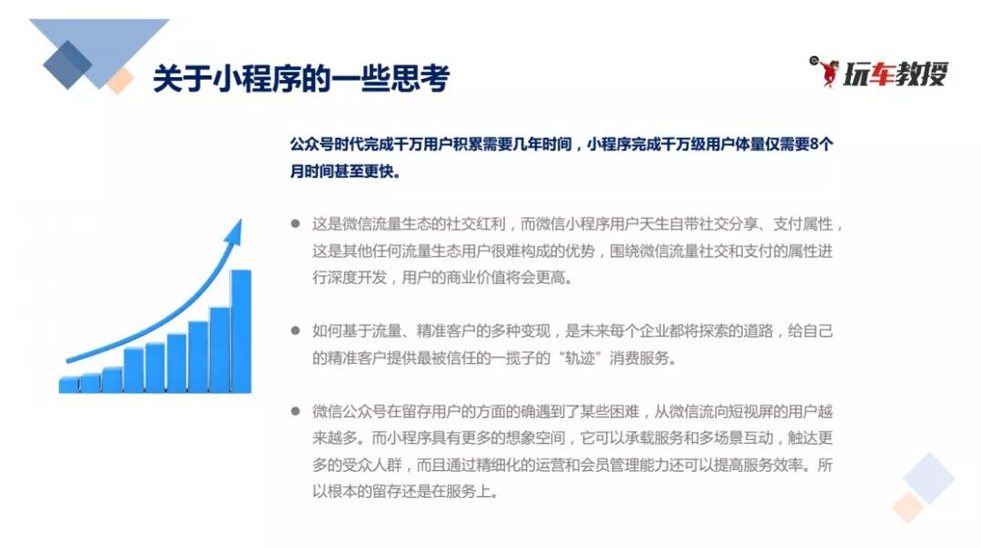 小程序和既有业务结合,往往会迸发出巨大的能量。作为汽车领域的头部大号,“玩车教授”在小程序推出的第一时间跟进。从工具、产品、运营趋势三个层面,将这微信这一流量洼地利用得当,真正做到了低成本获取用户。