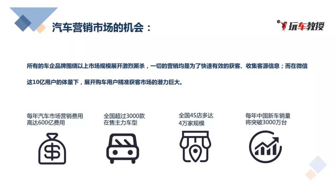 第四,市场营销机会上,有四个数据可以关注:一是每年汽车市场的营销费用大概在600亿以上,这仅仅是中国的市场规模;二是全国在售的车型超过3000款;三是全国的4S店大概有4万家规模;四是每年中国的新车大概有3000万台,而且这个数字会一直增长。