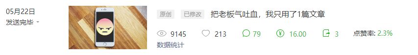 我之前写过一篇文章《把老板气吐血,我只用了1篇文章》,点赞率还是蛮高的,留言区一片好评,结果阅读量特别低。