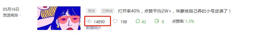 最后我们选择了“打开率 40%,点赞平均 2W+”。标题为《打开率40%,点赞平均2W+,咪蒙被自己养的小号逆袭了!》,阅读量是一般文章的 3 倍。