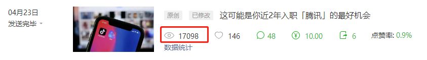 最终改成了《这可能是你近2年入职「腾讯」的最好机会》,这篇阅读量是平常的 1.5 倍。