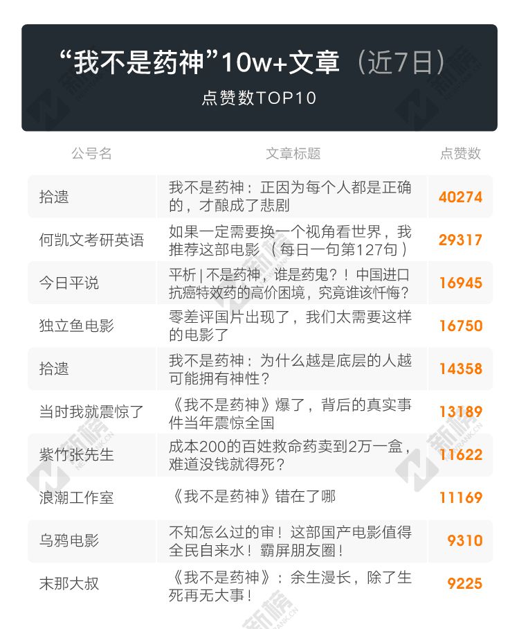 上映当天,“我不是药神”微信指数高达9898万。此外据新榜文章搜索功能显示,近7天内至少有2万多篇微信文章谈及“我不是药神”,其中204篇阅读达10w+。