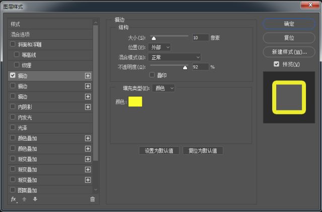 勾选“描边”选项,选择好相应的颜色和大小后,按确定保存。