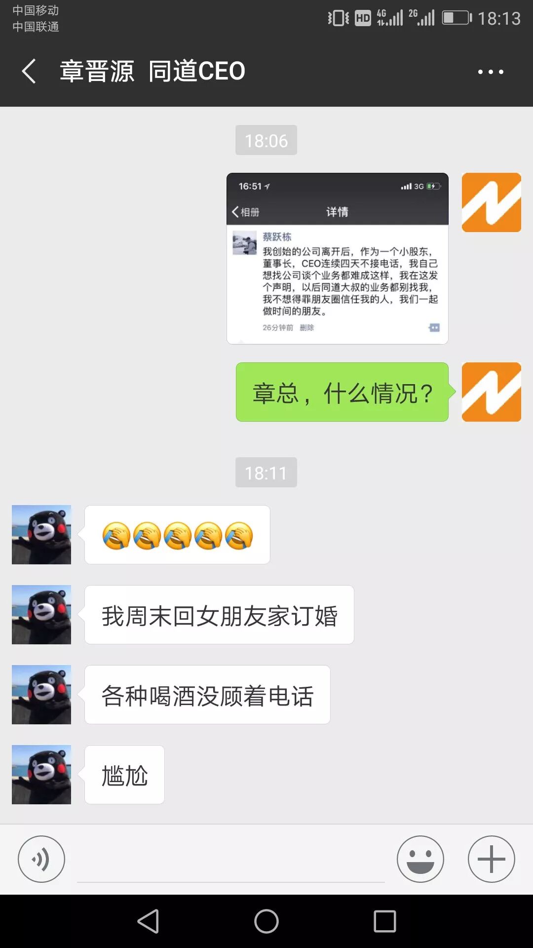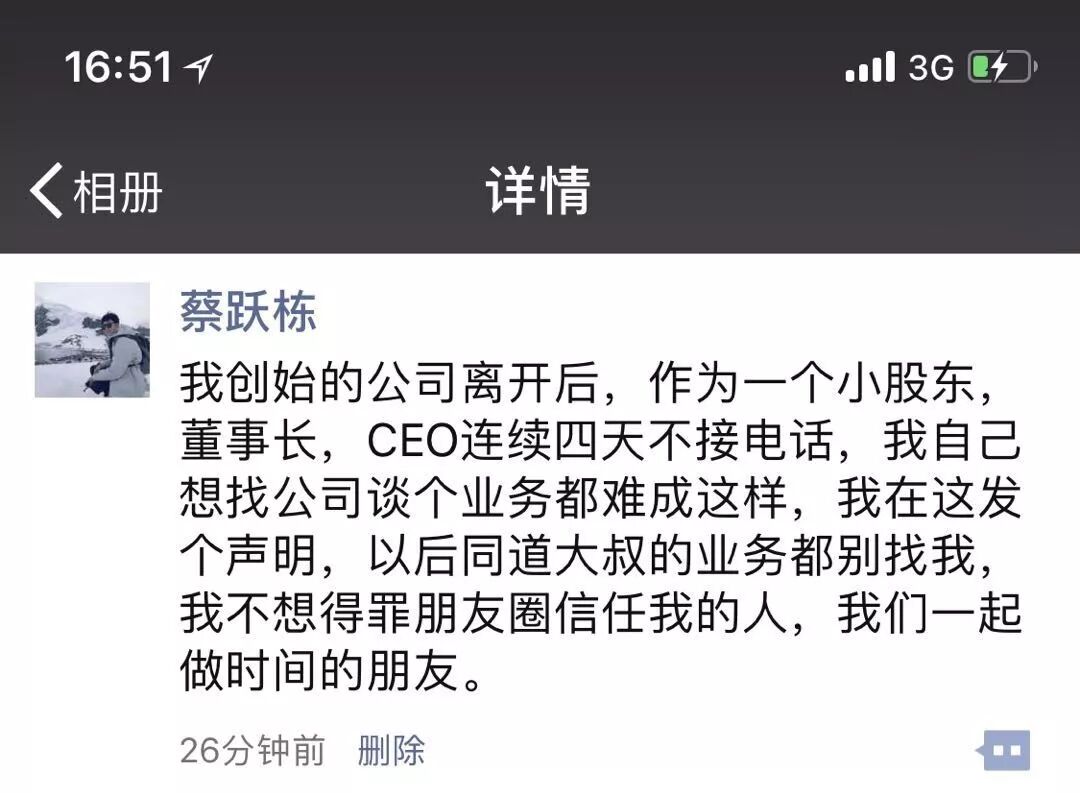 蔡跃栋发朋友圈称,自己离开同道大叔后,作为一个小股东(目前仍持有约10%的股份),找原公司谈业务联系不上管理层,并声称“以后同道大叔的业务都别找我”。