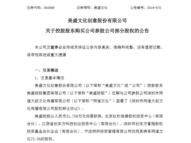 2016年12月8日晚,上市公司美盛文化发布公告,收购同道文化72.5%的股权。同道创始人蔡跃栋持股比例从约72%降到12.5%,算下来套现约1.78亿人民币。在此之前,美盛控股旗下的美盛文化创意股份有限公司已经持有同道15%的股权。