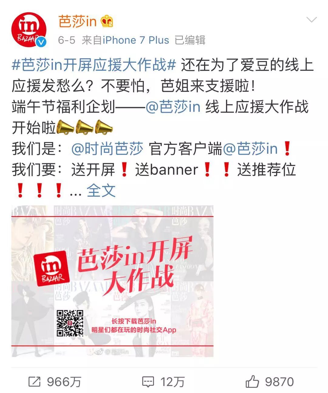 而在爆款电子刊之前,芭莎in还策划过一些其他的活动,比如举办开屏应援活动,微博转发量近1000万。