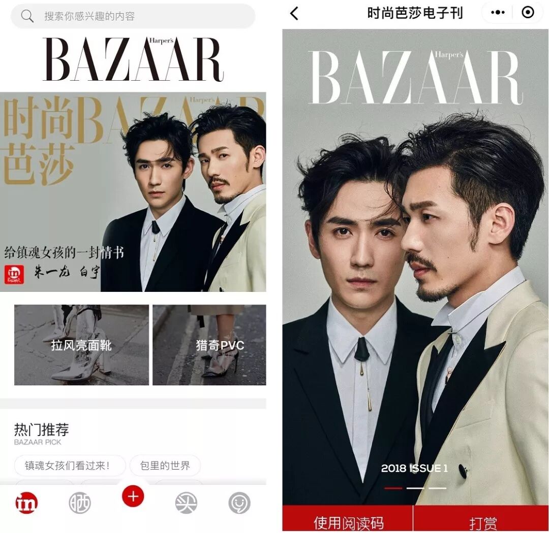 另一方面,选择镇魂兄弟作为首期封面人物,并非临时起意,而是时尚芭莎的预判。2017年时朱一龙和白宇的人气虽然不高,但芭莎团队当时就已经关注到他们,邀请他们入驻芭莎in,发布一些独家的图文动态。