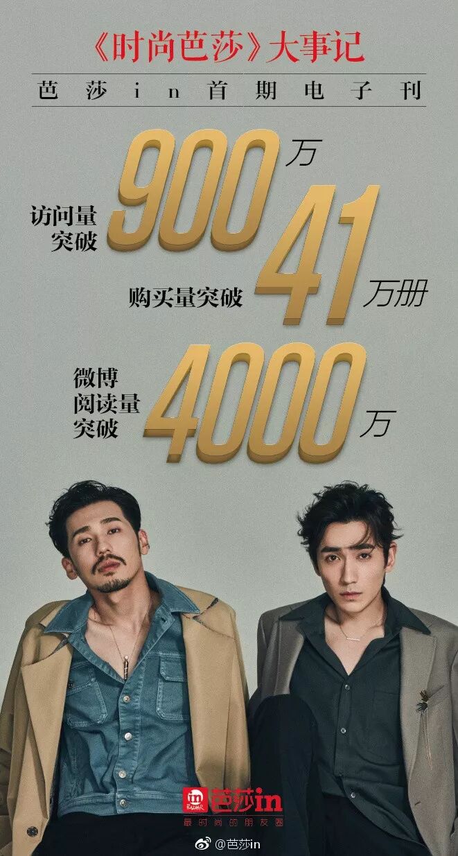 最终首期电子刊拿下了亮眼的数据:三天购买量超过41万册(6元/册,销售额近250万),访问量破900万,“芭莎in”App日启动突破400万,相关微博阅读量突破4000万……