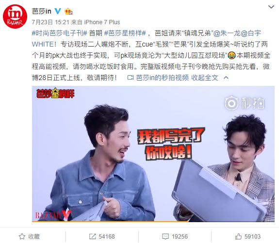 在宣传推广方面,芭莎团队也是提前做好策划。比如访谈视频里,朱一龙和白宇在写字板上写下了猜测表情包的内容。芭莎将写字板的内容作为提前放料发到微博上,瞬间就成了热门话题。