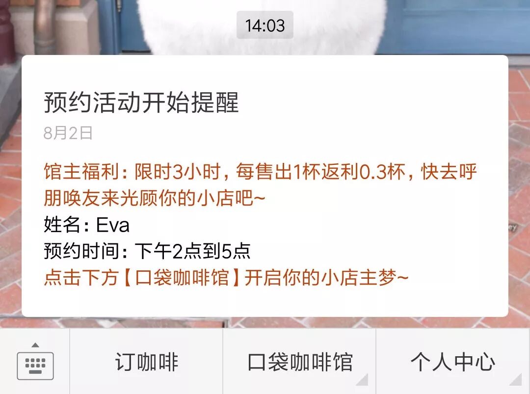 8月2日下午2点-5点,口袋咖啡馆推出3小时限时狂欢:每卖出一杯饮品,馆主就能获得0.3杯成长咖啡奖励。也就是说,在这个时间段奖励翻倍,以此来鼓励馆主主动推广自己的小程序。