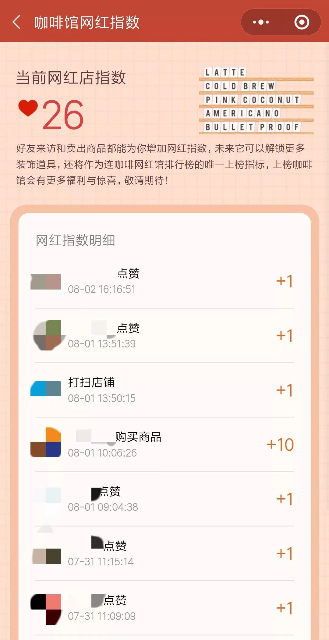 目前除了明星咖啡馆外,普通用户中最多的一天卖出了200多杯咖啡,网红指数达到2000+。