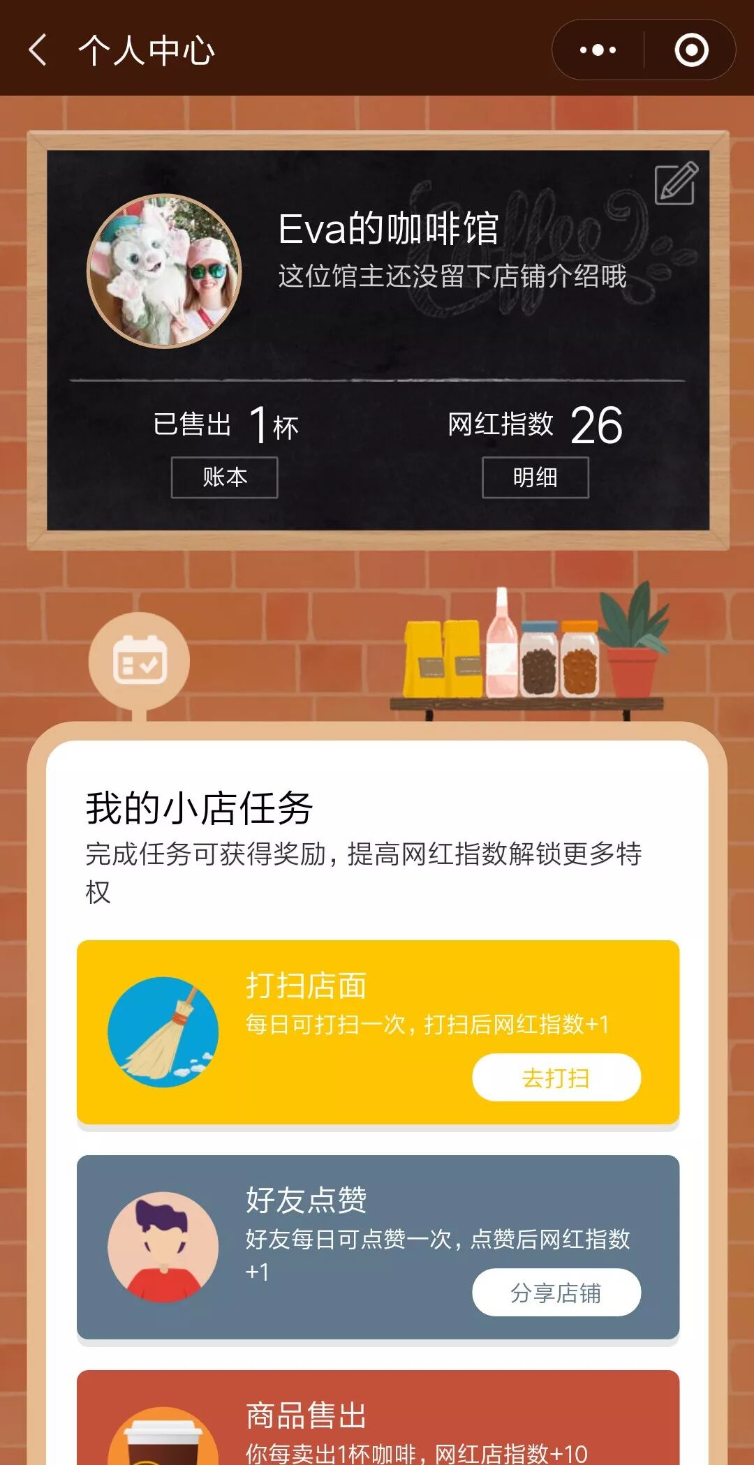 馆主可以在个人中心设置咖啡馆名称、店铺介绍,查看咖啡馆账本和网红指数明细,完成小店任务。虽然是线上的虚拟咖啡馆,但也能让用户获得更真实的经营体验。