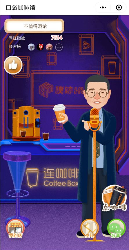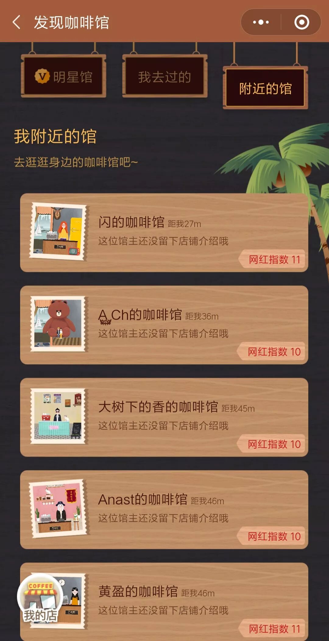 口袋咖啡馆自带社交基因,在装修完成后,用户需要将小程序分享到微信群或朋友圈,才能正式开业运营。另外,在发现里,用户还能去明星馆、去过的馆、附近的馆串门,看看其他咖啡馆做得怎么样。