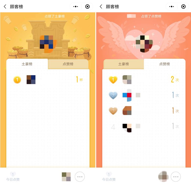 咖啡馆的顾客榜有两个维度,分别是土豪榜和点赞榜。土豪榜指的是咖啡馆顾客下单杯数排行榜,点赞榜则是好友来访次数。