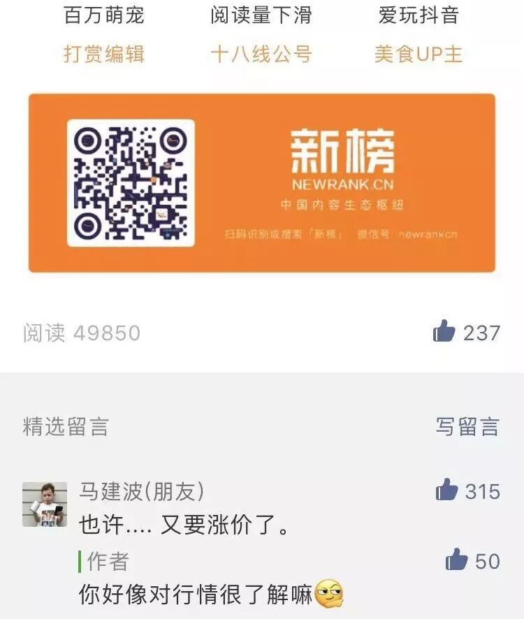 有意思的是,在昨天推文中,因为大家对“微信官方出手打击数据造假”的判断和期待,文末留言里,有榜友调侃(刷量市场)“也许.... 又要涨价了”,被点赞到第一位。