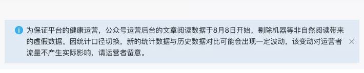 为保证平台的健康运营,公众号运营后台的文章阅读数据于8月8日开始,剔除机器等非自然阅读带来的虚假数据。因统计口径切换,新的统计数据与历史数据对比可能会出现一定波动,该变动对运营者流量不产生实际影响,请运营者留意。
