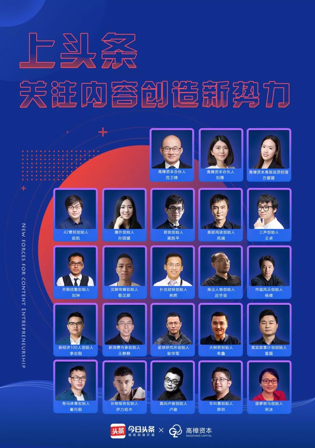 最近,包括高樟资本创始人范卫锋在内的3位高樟资本投资人,以及42章经创始人曲凯、商业人物创始人迟宇宙、三声创始人王卓等20位内容创业者,作为“内容创业新势力”集体入驻微头条。他们解读内容行业的新趋势,也聊自己的内容创业故事。