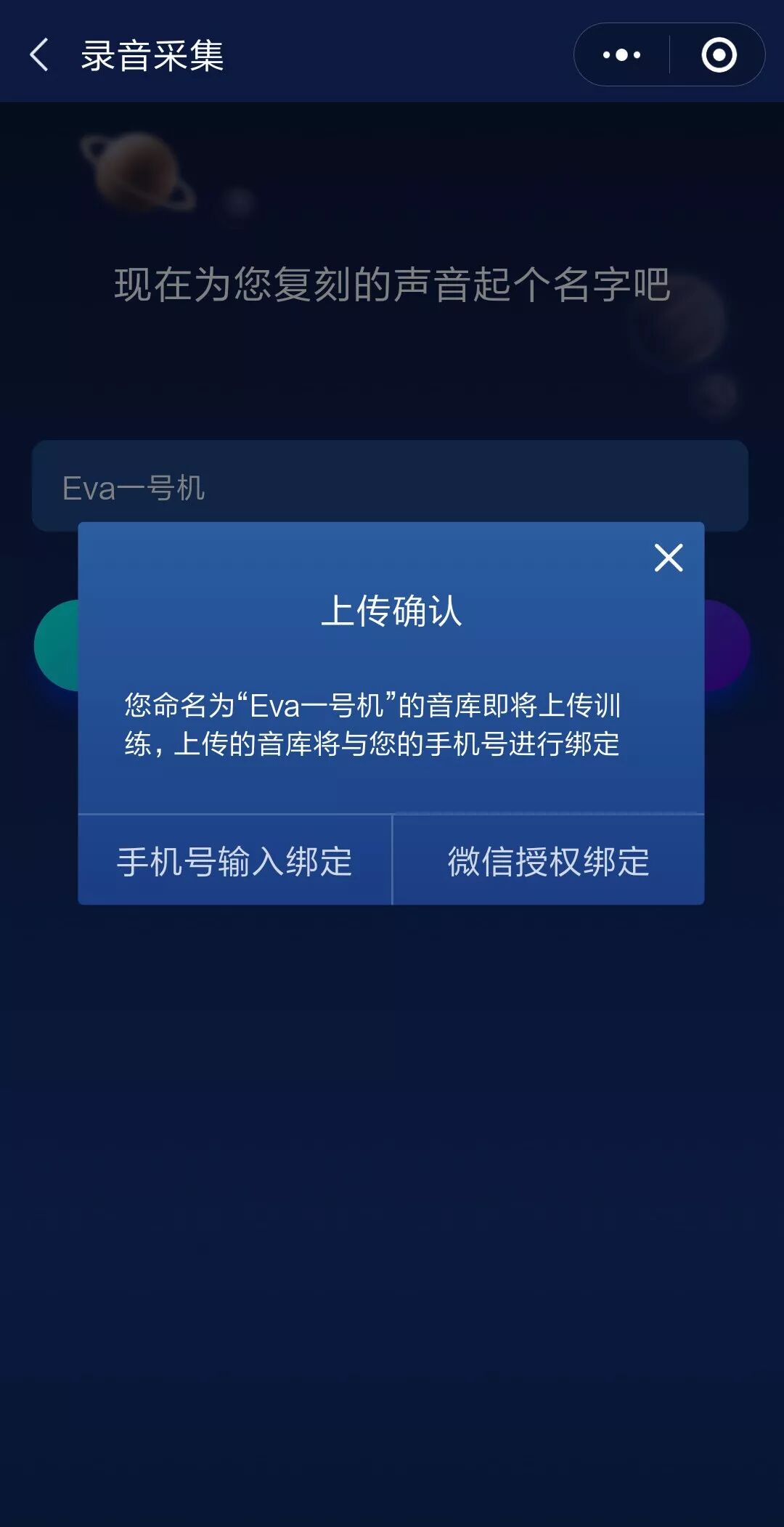 2. 为复刻的声音起名,绑定手机号或微信,上传录音。