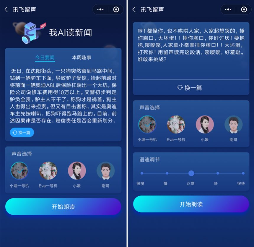 目前,“讯飞留声”为用户提供了两个功能,读新闻和秀声音。读新闻里是一些本周要闻和趣事,秀声音则是一些比较搞笑的文字。用户可以根据喜好,选择换一篇内容,还可以调节秀声音里内容的语速。生成朗读音频后,用户可以分享内容给好友或生成图片分享到朋友圈。康融告诉我们,用户使用秀声音更多一些,对分享带新增很有效,每次分享至少可以带5个新增用户。
