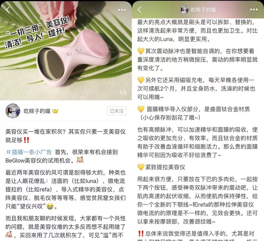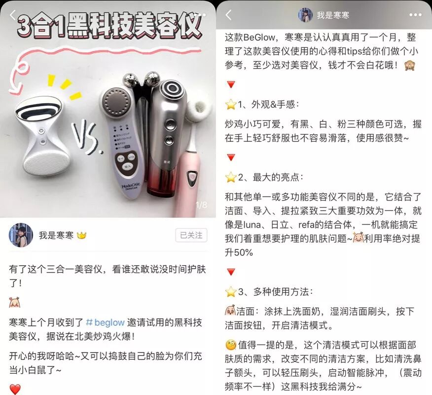所以,这次营销活动还投放了一批小红书博主,例如我是寒寒、吃粽子的猫等,她们都分享了自己使用BeGlow美容仪的笔记。