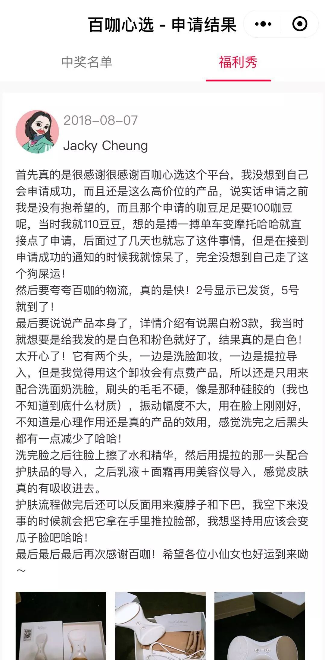 当然,奖品也不会白白送出。被选中的幸运儿就成为了“体验官”,在使用产品后,可以在百咖心选小程序内发表自己的评测内容。