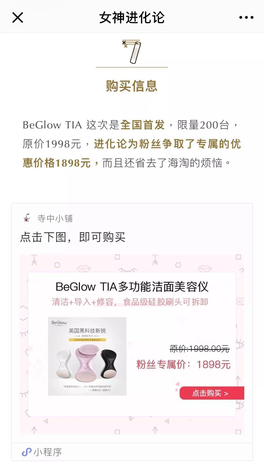 女神进化论:其实这不是进化论第一次接美容仪器,之前比BeGlow单价高的品牌我们也推广过。从历史数据来看,我们对于高单价产品的转化能力也是很出色的。