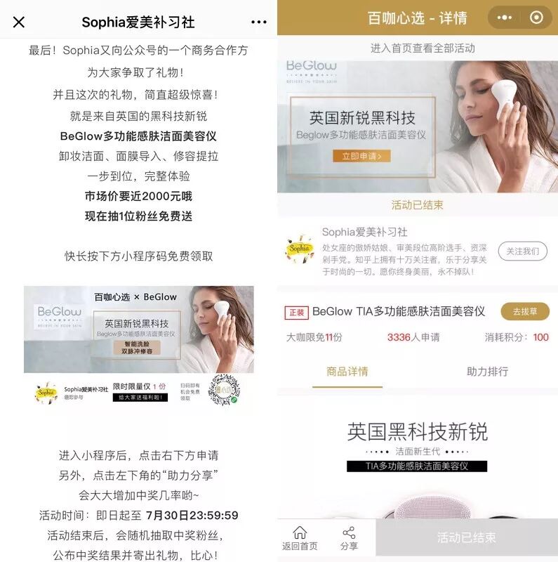 百咖心选是由众多KOL推荐的粉丝福利平台,在这次活动中一共选择了10个小而美账号,进行资源置换。即在文末放置贴片送福利,粉丝可以扫码进入百咖心选小程序内申请,几天后抽取10位粉丝送出BeGlow产品使用。