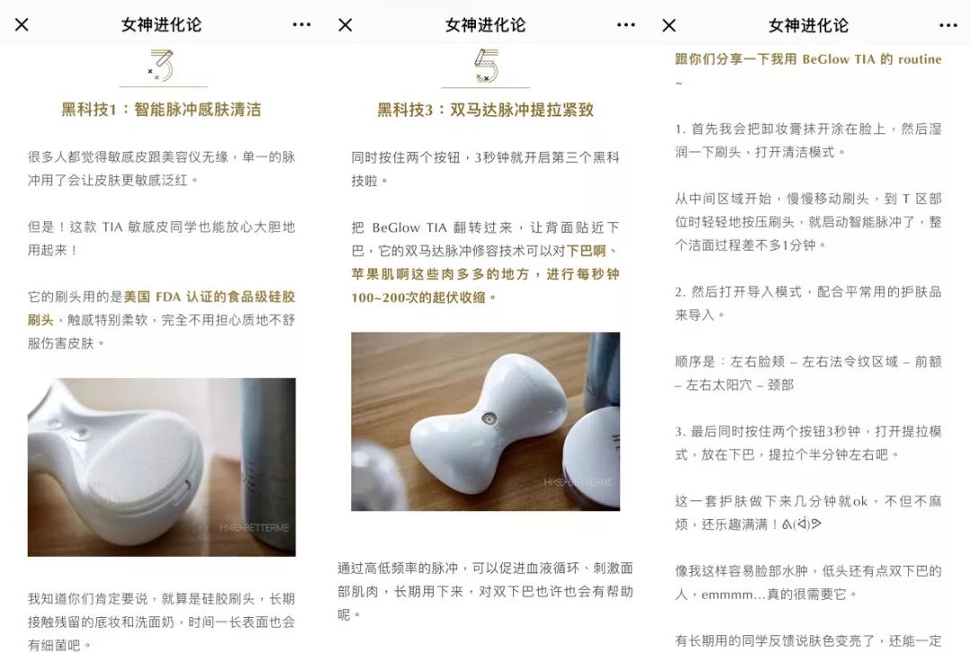 在为BeGlow品牌定制的推文中,女神进化论先介绍品牌和产品外观,再从3个黑科技入手详细介绍了品牌产品的功能,将原本晦涩的科技用通俗易懂的语言表述出来,文章最后分享了自己使用这款洗面仪的过程。