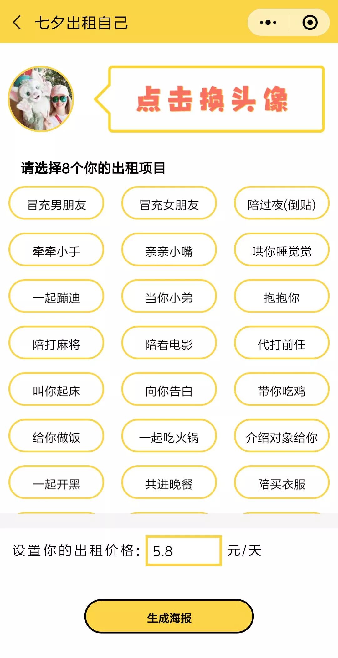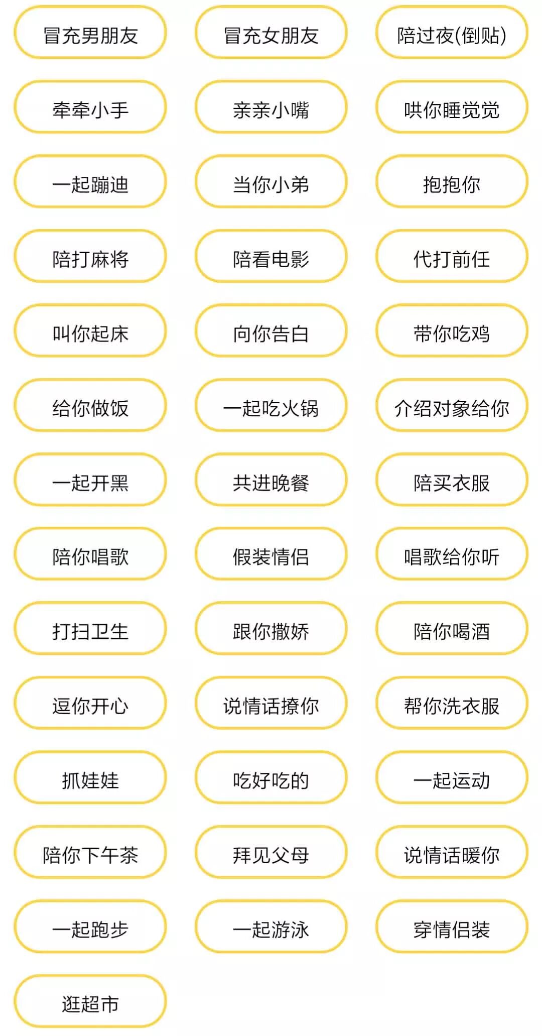 1. 至多挑选8个自己出租的项目,包括冒充男女朋友、牵手、亲嘴、哄睡觉等