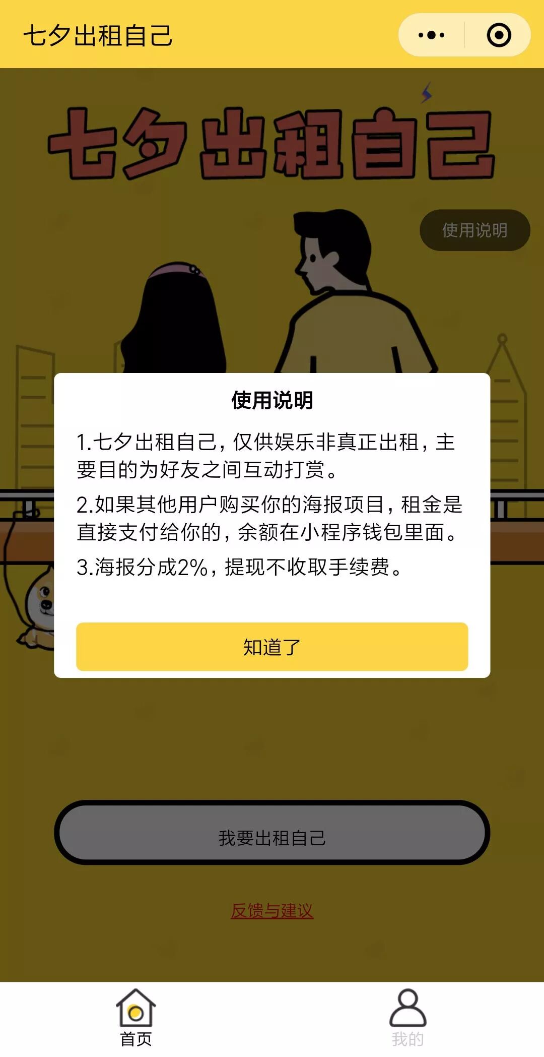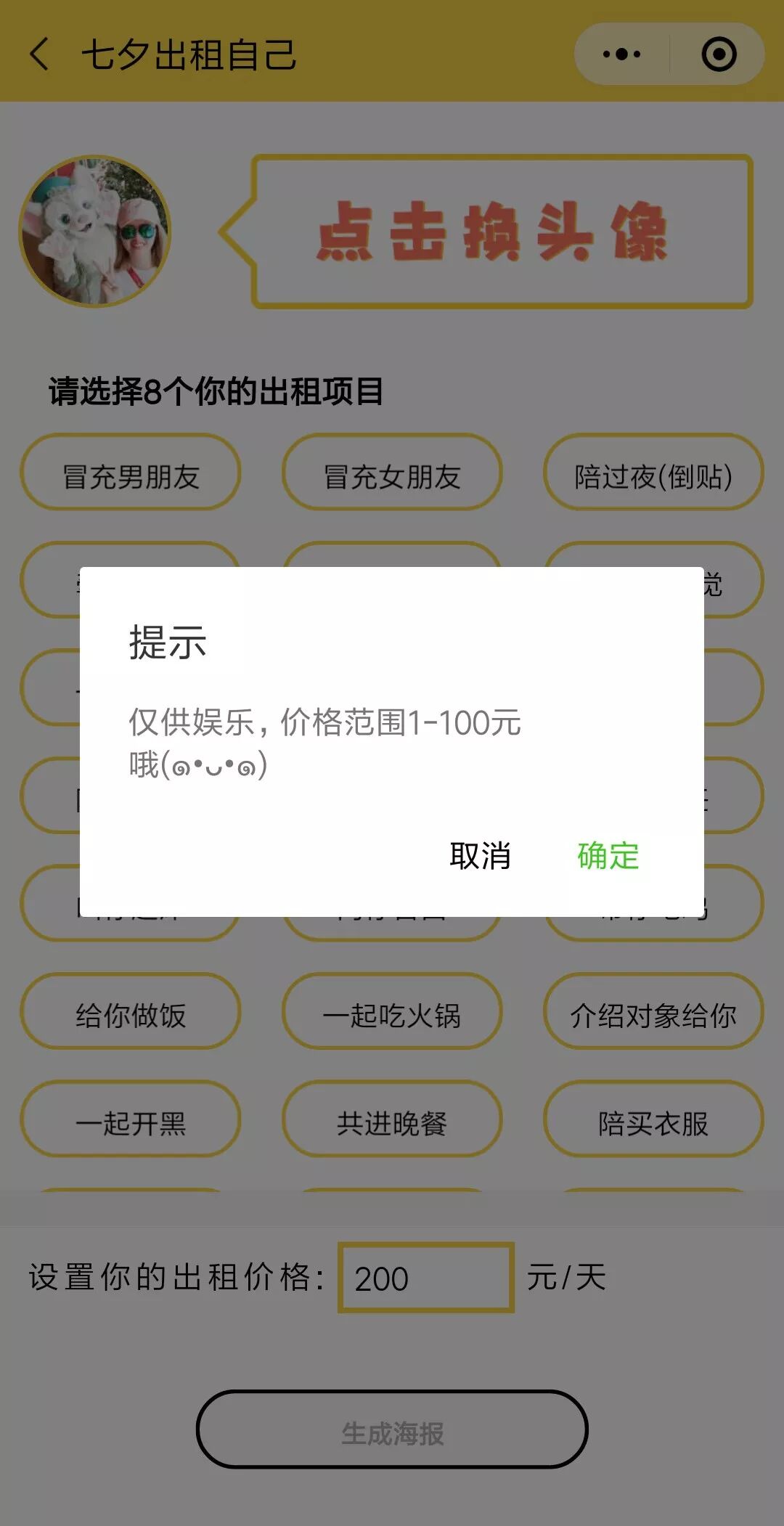 近日,一个名为“七夕出租自己”的小程序火了。功能很简单,分为三步: